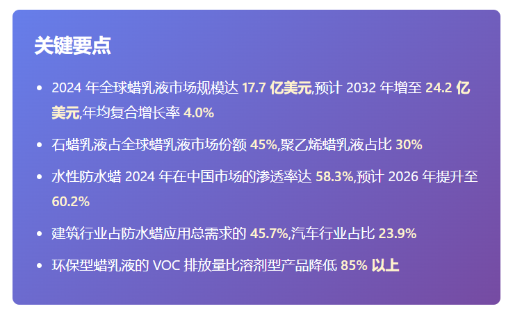 包装行业占防水蜡应用需求的18.2%,主要用于纸张的防潮处理、防油处理和表面光泽提升。根据PeakUniversalBusiness的应用指南,石蜡乳液在造纸和包装行业的应用包括:纸张的防潮和防粘处理、改善印刷适性和光泽度、增强食品包装的耐油性。