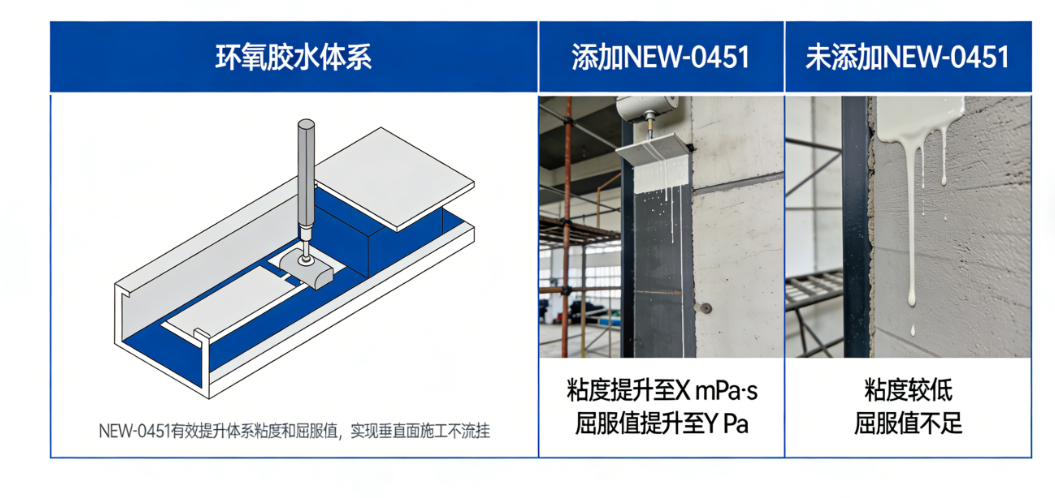 在环氧胶水体系中,NEW-0451能够有效提升体系的粘度和屈服值,实现: